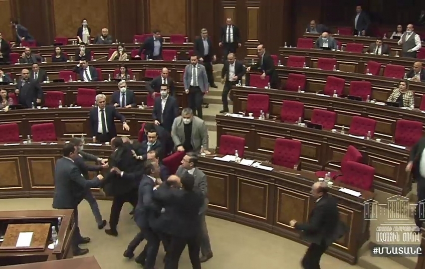 Լեզվակռիվը սաստկացավ ու վերածվեց ծեծկռտուքի: Մարուքյանը ամբիոնից, իսկ Միքայելյանն առաջին շարքի իր տեղից գրեթե միաժամանակ արագաքայլ շարժվեցին միմյանց ընդառաջ, եւ առաջին ապտակախառն հարվածը հասցրեց Միքայելյանը: Ճիշտ նույն պահին վրա հասան գործընկերները եւ իրարից բաժանեցին կռվողներին, բայց Մարուքյանը, այնուամենայնիվ, կարողացավ ոտքի ոչ այնքան ուժեղ հարվածով «մանրը» վերադարձնել: Չորս-հինգ տասնյակի չափ պատգամավորներ խմբվել էին իրար գլխի, եւ այդ խառնակ պահին Մարուքյանը եւս երկու հարված ստացավ` մեջքին եւ դեմքին: Ինչպես պարզվեց, հետեւից հարված հասցնողները «իմքայլական» պատգամավորներ Արտակ Մանուկյանը եւ Վահե Ղալումյանն էին: Կրքերը որոշ ժամանակ չէին մարում, եւ նիստը նախագահող ԱԺ խոսնակը ստիպված եղավ հայտարարել ընդմիջում, որից հետո «Լուսավոր Հայաստան»-ը լքեց դահլիճը` խոստանալով չվերադառնալ, մինչեւ որ տեղի ունեցածին ու նրա հետեւանքներին չտրվի պատշաճ քաղաքական գնահատական: